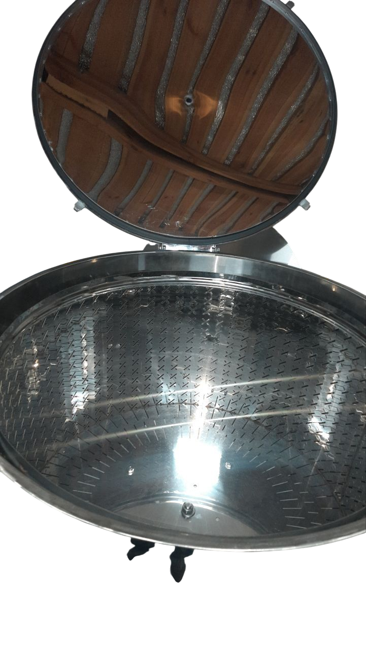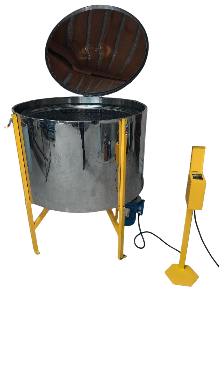 Центрифуга для перетопки рамки Центрифуга предназначена для извлечения воска из воскового сырья, под действием пара. Главной особенностью центрифуги является вращающийся сетчатый ротор, который создает центробежную силу и увеличивает эффективность выхода воска в несколько раз. Все детали центрифуги, соприкасающиеся с воскосырьем, изготовлены из пищевой нержавеющей стали AISI 304. Преимущества: 1.Высокая температура и вращение сетчатого ротора позволяет вытопить практически весь воск. 2. Корпус центрифуги имеет двойные стенки между которыми прокладывается теплоизолятор, что позволяет поддерживать высокую температуру с меньшими затратами. 3. Корпус центрифуги и подставка разъемные, что упрощает процесс её перемещения через дверные проемы. Принцип работы: Загружают восковое сырье в сетчатый ротор центрифуги. Затем необходимо включить парогенератор и дать воску расплавится и стечь в полость центрифуги. Остатки воска выходят под действием центробежной силы, после включения привода сетчатого ротора. Затем остатки воскосырья удаляют из сетчатого ротора и производят его очистку. Объем - 274 литра Общий диаметр - 900мм Высота - 1074мм Толщина дна основания - 1мм Толщина крышки - 1.5мм Толщина стенки - 1мм Мощность привода - 0,75кВ Вес без мотора - 100кг